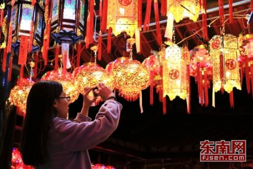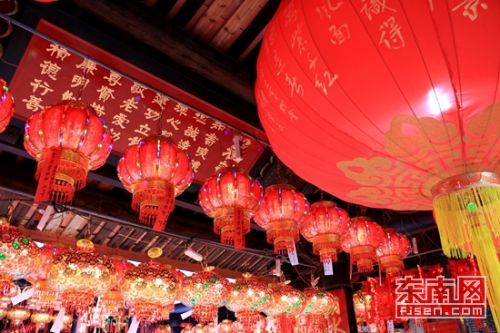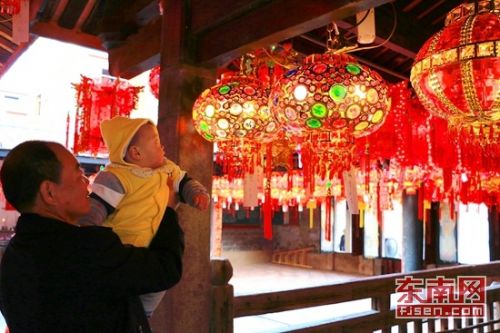 纱质的、纸质的、木质的、琉璃点缀的,正月十三的长泰县岩溪镇珪塘叶氏追远堂内,挂满了各式各样的宫灯、走马灯,暮色降临,灯一亮起,百年老厝内霎时成为一片红火热闹的灯笼海,人们三五成群赏花灯,看红榜,祭先祖。