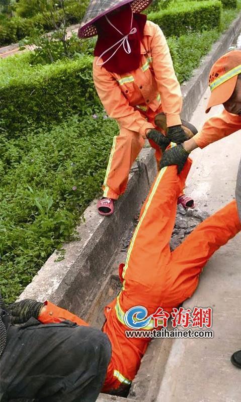 两条腿被一拉一拽,一名养护工人伏身从1.2米深的集水井管道里,徒手拾出刚敲碎的碎石,清理被堵塞的集水井管道。近日,这尽职尽责的一幕出现在东山县道西铜线上。