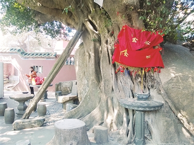自古以来,漳台人视榕树为驱凶避灾的圣树。每逢家中有人患病,需要安静调治,或筹办喜庆大事,怕外人“冲跑”了喜气,人们就在外门的门环上挂上两束青翠欲滴、箍着红布条的榕树枝叶,谓之“插榕青”,借此告启来客:“谢绝入内”。笔者曾在东山岛铜陵镇发现一户人家古时候插榕青形成的奇观:其大门门框均为粗硕的榕根形成,门楣上老态龙钟的古榕,枝叶葳蕤,根须如长髯飘拂。据主人陈先生介绍,他的先祖有一年端午节时采撷一桠榕枝插在杉木做的门框缝隙辟邪,时逢淫雨连绵,生命力顽强的榕枝生成了气根,日久年长,竟形成有生机活力的榕门,至今已有200余年历史。漳州著名书画家马驰先生观赏后啧啧称奇,特为这一奇观题匾“榕庐”,并附词赞美:“苍郁天年,陵岛一绝。”小榕枝形成大榕门,堪称今古奇观!
