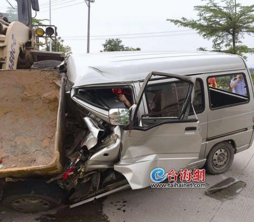 华安:面包车与推土机相撞 面包车车头变形2人被困