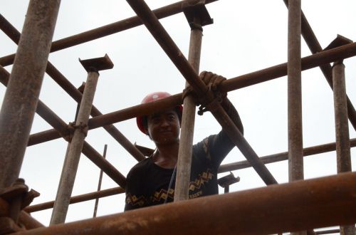 5月8日,位于华安经济开发区的振立工贸项目4号框架结构厂房工地上,建筑工人正在捆绑钢筋,搭建脚手架,该厂房预计月底可封顶,这是开发区火热推进的重点项目之一,总投资1亿多元。
