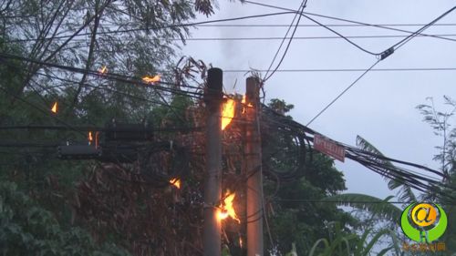 当天下午5点10分左右,记者赶到现场看到,电线杆的火势正向东西两面蔓延,上面缠满了粗细不均的电线,一些烧坏的电线还挂在电线杆上,一团团小火球不断往下掉。由于火势所处位置为公路旁,来往车辆较多,情况十分不妙。