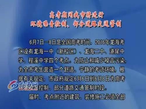 龙海高考期间将进行环境噪音控制、部分道路交通管制