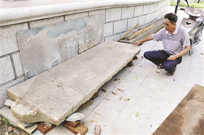 最近,龙海市政府对月港古码头历史文化遗址进行重新规划建设,埭内社妈祖庙也进行了局部的移动,这块碑记从庙后面被收置起来。阮国典告诉记者,等妈祖庙修缮完成后,他们将把这个碑记立在庙前的庭院里。(邓娜文/图)