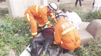 “救命啊,好痛啊,我整个手都麻掉了。”消防官兵到达现场后,发现一名穿黑衣的女子横躺在事故桥下草丛中,不停地喊着救命。消防官兵一边安慰受伤女子,一边在现场医护人员的指导下,利用担架慢慢将女子抬上救护车,送往医院进行救治。