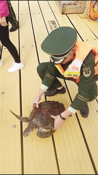 12月23日12时许,龙海市公安局边防大队浯屿边防派出所民警联合浯屿岛海洋开发有限公司员工,将一只国家保护动物绿海龟放归大自然。