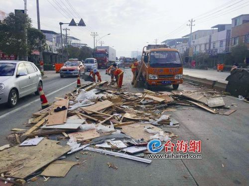 随后,龙海许林头公路站许站长接到110联动电话,在询问了事故情况后,立即带领着养路工前往事故现场清理路障。