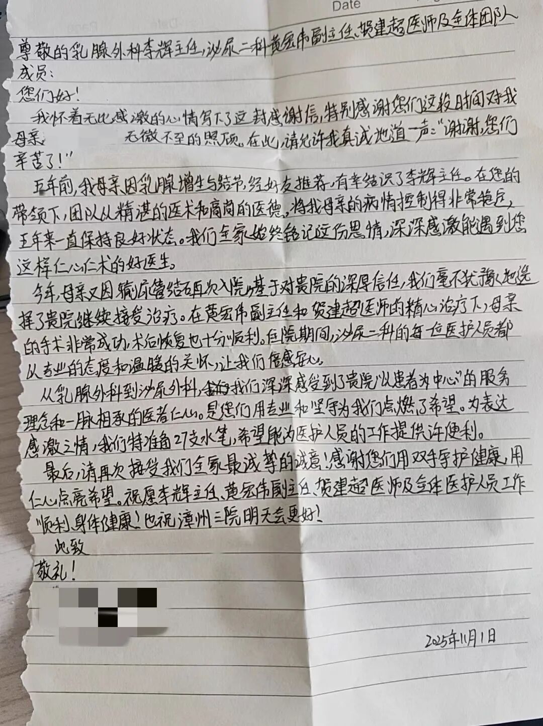 “从乳腺外科到泌尿外科,是你们用专业和坚守,为我们点燃了希望。”今天,科室收到了一份特别的“礼物”——一封来自患者家属亲笔写下的感谢信,以及27支再实用不过的水笔。字里行间的真诚,让整个办公室都暖了起来。