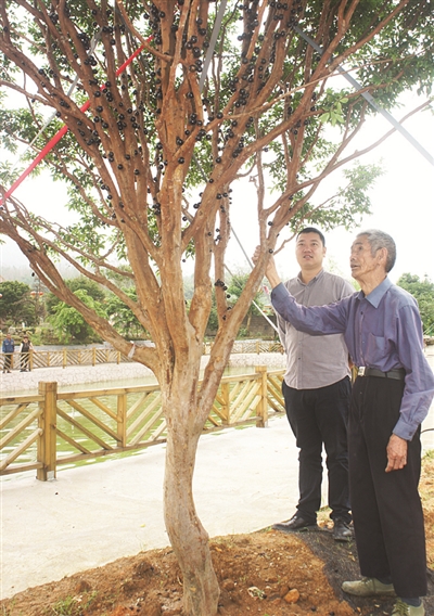 “树葡萄”这一生态奇观,对李友山这样的老农来说,很是新奇,就是一些游客也感到好奇,慕名前来观赏。“这片‘树葡萄’,是2007年春我从台湾引进种植的。”经营者刘阳鹏连忙向大家介绍说,“树葡萄”学名“嘉宝果”,果实结在树干上,外形如葡萄,呈紫黑色,却不像葡萄成串悬挂,故名“树葡萄”,其营养价值、经济价值都比较高。(徐东升文/图)