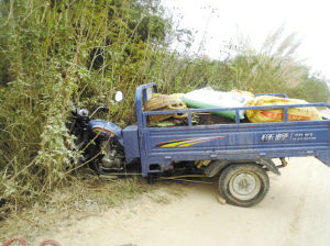 2月4日下午1时30分,在南靖县靖城镇沧溪村往部前村九龙江堤岸路上,一辆载着土杂肥的三轮摩托车,因道路坎坷不平,三轮车头轻体重,加上司机是个新手,车子在颠簸中不听使唤,失控后栽下堤坡,幸亏被堤坡上灌木丛卡住了,否则后果不堪设想。(蔡其标 摄影报道)