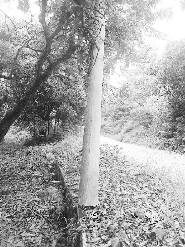 7 月19 日,在南靖县靖城镇径里村金美山社通往御史岭的道路旁, 一根线杆底部已断裂, 暴露出的钢筋将长、短两端水泥管牵系在一起。线杆倾倒时正好将线杆末端卡在路边一棵龙眼树的树梢上,线杆与路面呈45 度角倾斜。往返于这条道路上的人很多, 望有关单位及时移走断裂线杆并重新竖立新线杆,否则,后果不堪设想。(蔡其标 摄影报道)