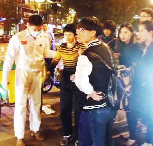 钟法路来往的车辆越来越多,环卫工人躺在路中央很危险。危急时刻,几个青年人冲上前。环卫工人身上倒是没有血迹,但叫唤没有应答。一位20岁出头、学生模样的姑娘,将她抱在怀里,头部放在膝盖处,拧开随身携带的水瓶喂水。同时,小姑娘还一直掐环卫工人的人中。前来帮忙的人越来越多,有的为了提示过往车辆绕行、避免再次发生车祸,在四周围成保护墙,守护着环卫工人;有的则掏出手机拨打110和120。