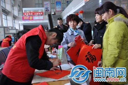 据漳州车务段团委副书记李楠介绍,当日,志愿服务活动主要包括帮助旅客进出车站,提供免费医疗及亲情电话,义务写春联等内容。“我们想让旅客把温暖带回家。”她说,这样的志愿活动已连续举办三年,也深受旅客的喜爱。