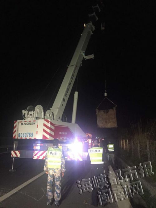 昨天凌晨,这块后栏板被漳州高速清障部门动用吊车运走。