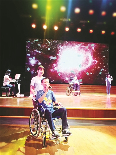 “孤独站在这舞台,听到掌声响起来,我的心中有无限感慨……”今年5月11日,徐朝东坐在轮椅上,从舞台下方徐徐升起,观众报以阵阵掌声。可当时他被感动得想哭,以致唱不出声,将泪水强忍住,这才将《掌声响起来》唱出来。对于徐朝东而言,音乐梦想其实才刚开始,需要一如既往地努力,一直唱下去。 (记者罗培新文/图)