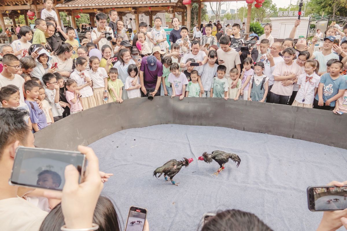 来自学校和社区的表演者轮番登场,带来闽南鼓舞、武术、竹笛、皮影戏、古典舞等精彩节目,充分展现非遗的当代活力。现场还设有贝雕、功夫茶艺、漳州胖饼等八个非遗与传统手工艺市集展位,让市民近距离体验闽南文化。现场,漳州斗鸡表演与有奖竞猜环节将气氛推向高潮(题图)。