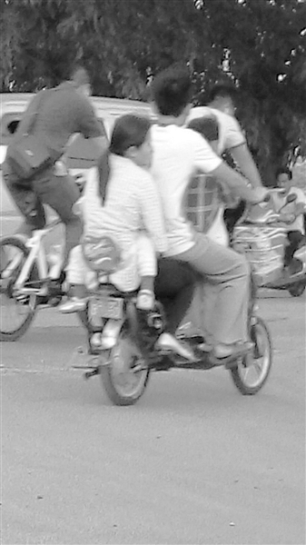 4月9日,有人骑绿牌电动车载3人行驶在市区江滨路,其中坐在后面的妇女抱着一名小孩,前面踏板上站着一名小孩。这样超载,万一发生不测,后果不堪设想。