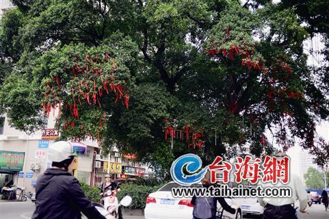“榕树被悬挂红布条,严重影响了市容市貌。”昨日,市民卢先生拨打导报漳州新闻热线反映,位于漳州市区钟法路的一棵百年大榕树被旁边的商家包装成“许愿树”。