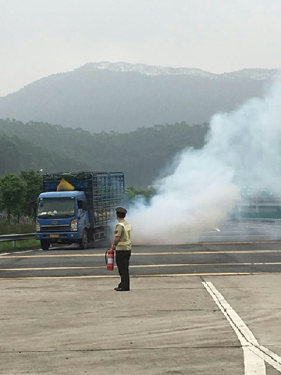 5月2日上午9:35,一辆载着鸭子的货车行驶至平和高速收费站出口内广场突然浓烟滚滚,情况非常危急。