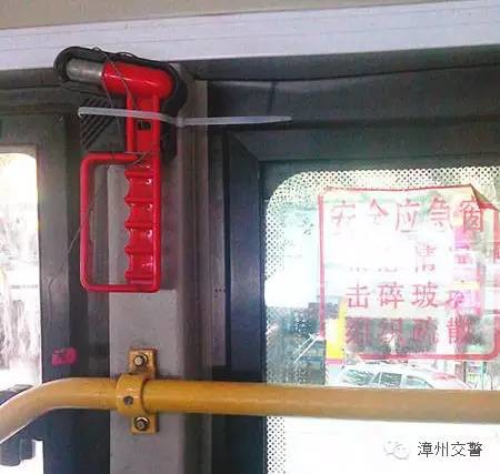 4、公交车门打不开时,乘客可用手旋转后车门上方的红色手动旋转开关,再拉车门扶手,开车门逃生