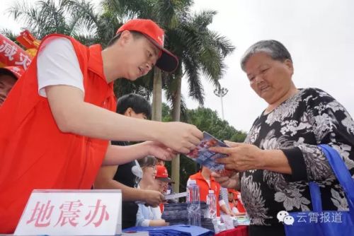 “大妈,请不要轻信地震谣言,关键要‘一问、二想、三核实’”12日,志愿者为路过的市民详细讲解防震常识。今年5月12日是我国第八个“防灾减灾日”,当天上午,云霄人民公园门口人头攒动,县地震办、安监局、红十字会、漳州能源等十多个部门和机构在此联合开展防灾减灾科普宣传活动。