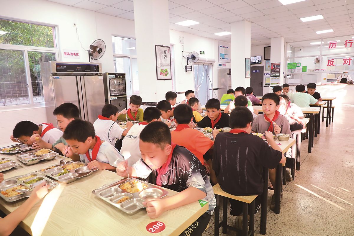 和平中心小学食堂,孩子正在就餐。