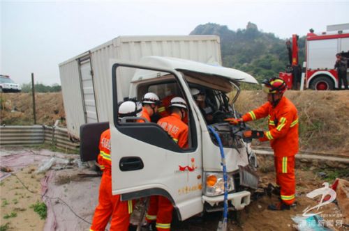 消防官兵到达现场,经观察发现,一辆车牌为闽D·51U82的白色小型货车冲进公路边的田野里面,撞击导致驾驶室严重变形,两名男子被困在驾驶室内,受伤严重意识模糊,情况危急。警戒小组立即做好现场警戒严禁围观群众靠近,并时刻观察货车情况以防发生侧翻;救援小组利用液压破拆器材展开救援。消防官兵发现副驾驶室被困人员并未被卡但受伤无法动弹,立即将其救出后抬上救护车。另一名被困人员的双脚被变形的驾驶室卡主无法动弹,消防官兵利用液压顶杆与液压扩张器配合救援,大约10分钟后,成功将其救出,所幸两人并无生命危险。