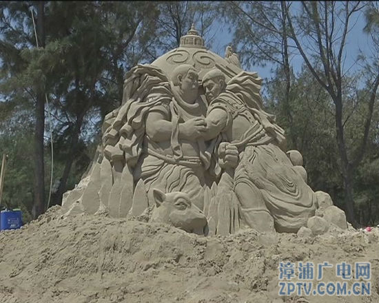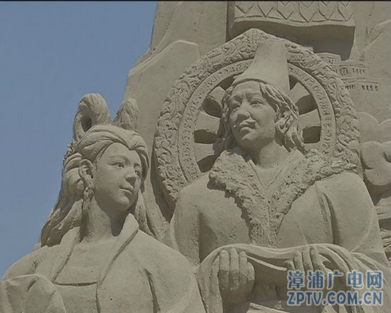 翡翠湾海景度假酒店销售经理 张贞春:这个观景台游客是可以登高望远的,一面可以看海,看台湾海峡,另外一面可以看我们整个沙雕园的全景。我们观景台的南面主要是刻上郑和下西洋这么一个气势磅礴的商队和船队这种文化元素,另外北面我们是刻上张骞出使西域的文化元素。